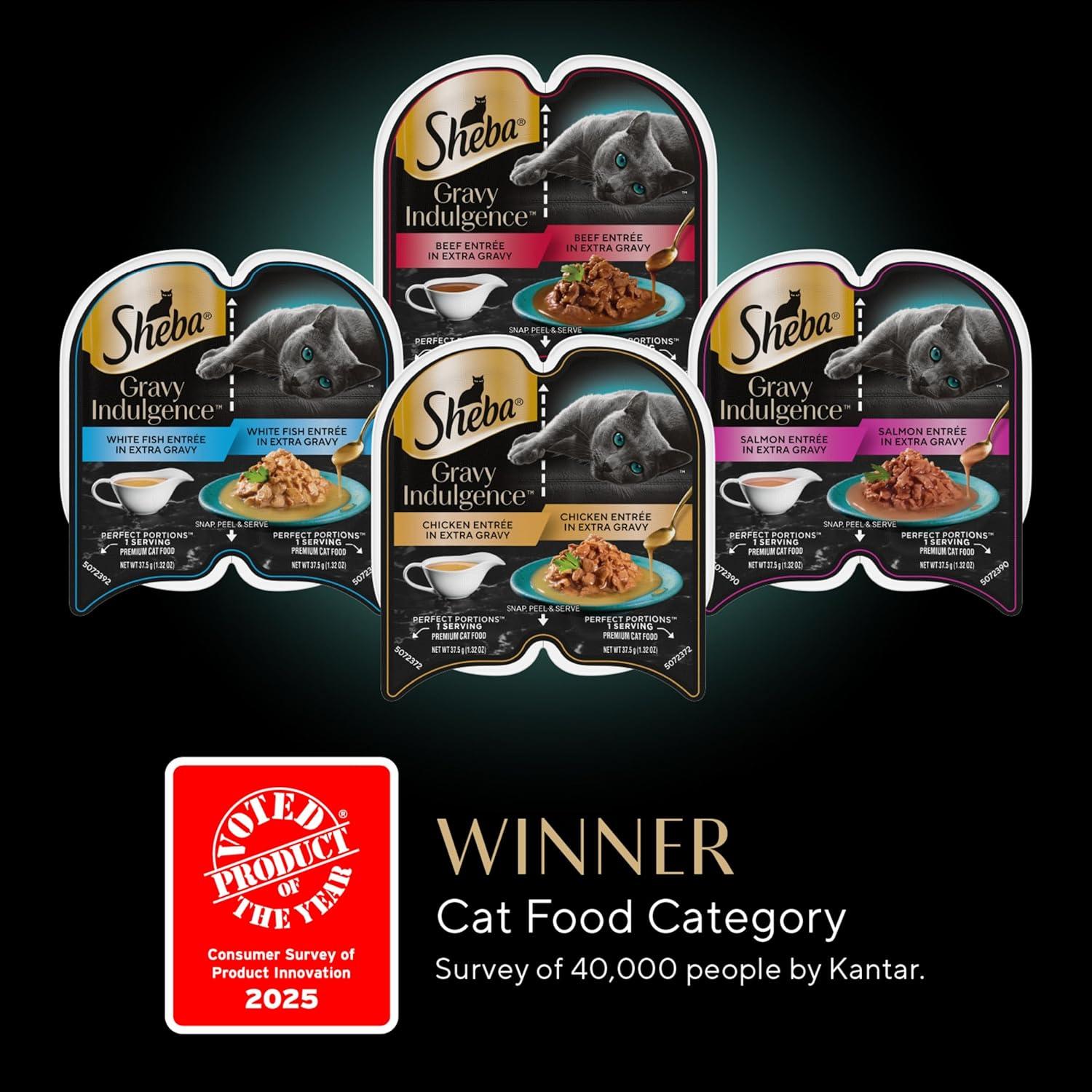 Extra Gravy, Extra Love: Sheba Gravy Indulgence Wet Cat Food delivers 70% gravy to 30% chunk, serving up extra gravy when compared to Sheba Perfect Portions Cuts in Gravy