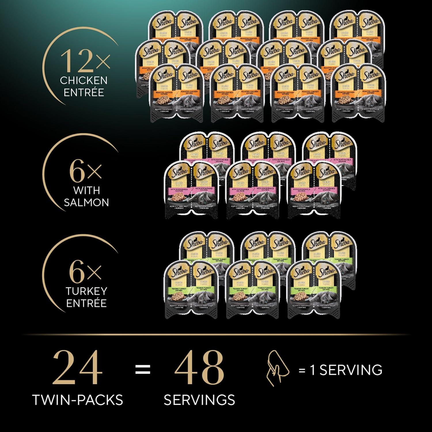Sheba Perfect Portions Wet Cat Food Cuts in Gravy Variety Pack, Roasted Chicken Entree, with Sustainable Tuna, and Tender Turkey Entree, 2.6 oz. Twin-Pack Trays (36 Count, 72 Servings)(Chicken Salmon & Turkey)