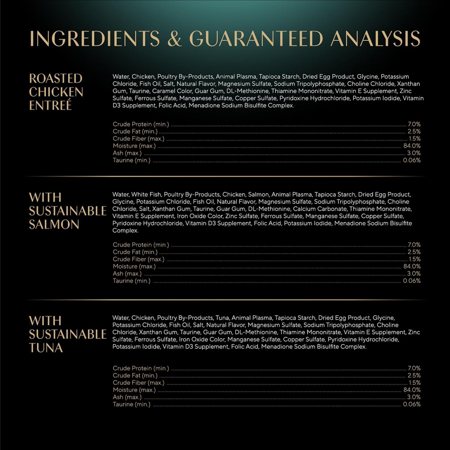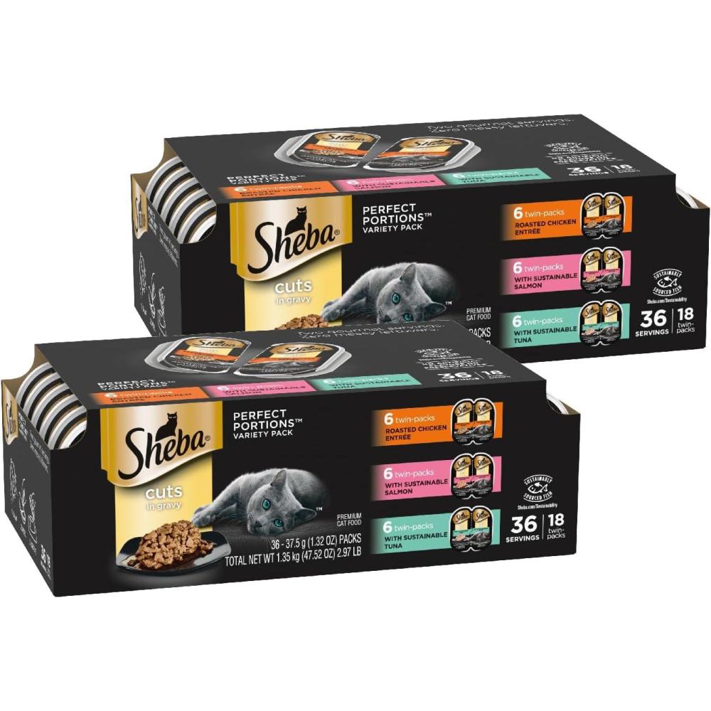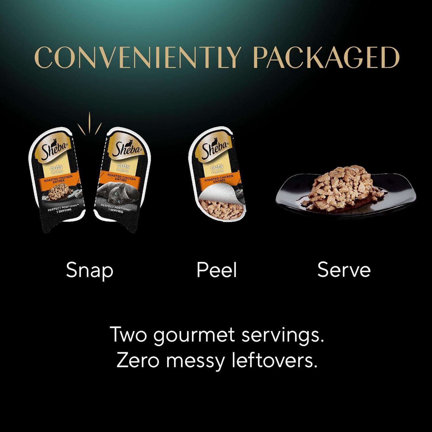 Cats know what they want: the delicious taste of Sheba Perfect Portions Wet Cat Food Cuts In Gravy. The succulent cuts of roasted Chicken, with sustainable Tuna, or tender Turkey in a delicious gravy deliver a wet cat food your feline will love. Sheba Perfect Portions Wet Cat Food has two convenient, portioned trays for a delicious serving with zero messy leftovers every time. Sheba Wet Cat Food is formulated without grains, corn, or soy and contains no artificial flavors or preservatives; although trace amounts may be present due to cross-contact during manufacturing. Even the pickiest cat is sure to enjoy it. Savor every delicious moment with Sheba Wet Cat Food Cuts in Gravy.