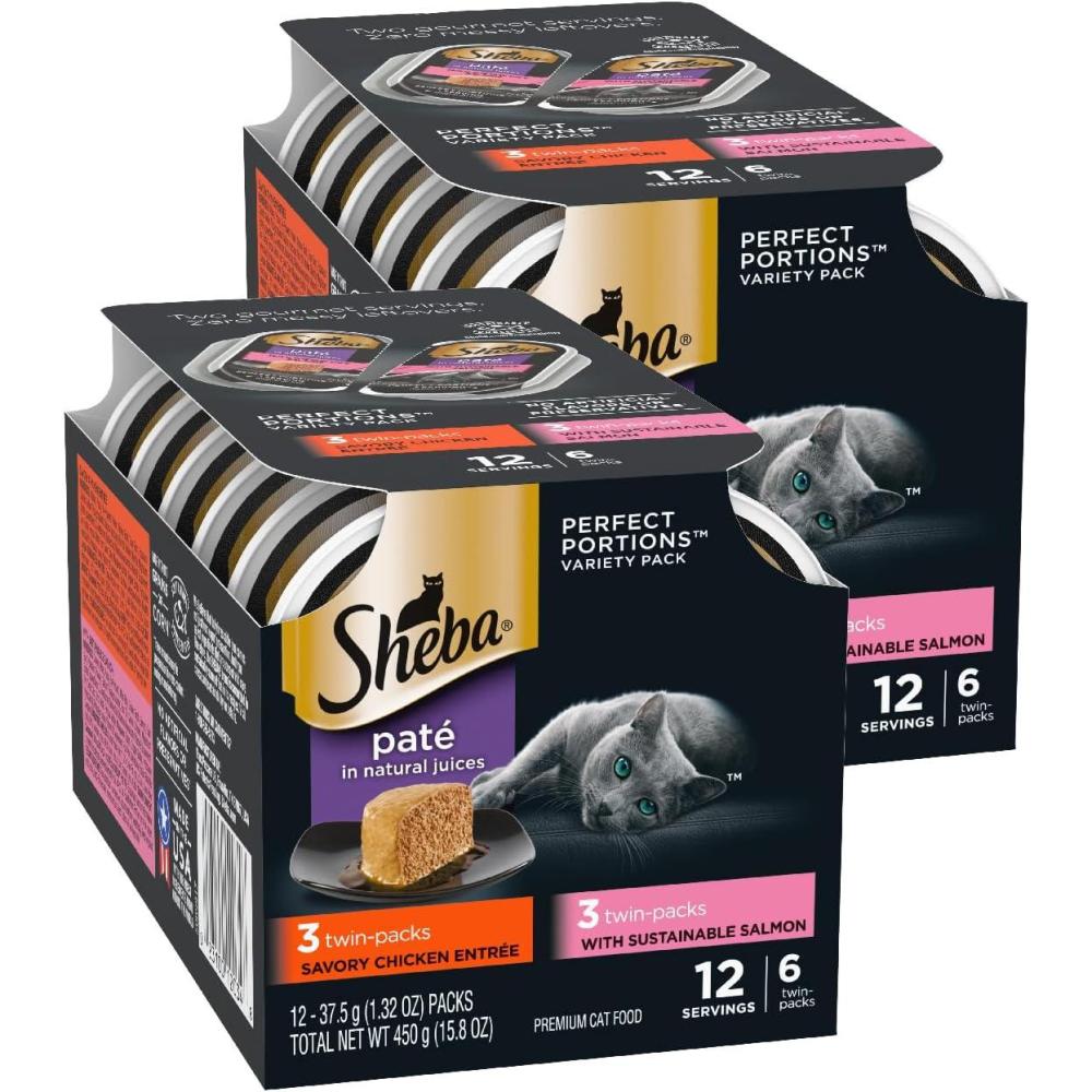 Sheba Perfect Portions Wet Cat Food Pate with Sustainable Salmon, Signature Seafood Entree, and Tender Whitefish and Tuna Entree Variety Pack, 2.6 oz. Twin Pack Trays (24 Count, 48 Servings)(Chicken & Salmon)